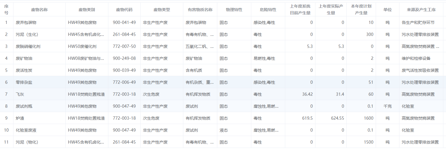 危廢種類:廢棄包裝物、污泥(物化)、廢脫銷催化劑、污泥(生化)、廢礦物油、廢活性炭、零排雜鹽、飛灰、廢試劑瓶、化驗室廢液、爐渣。